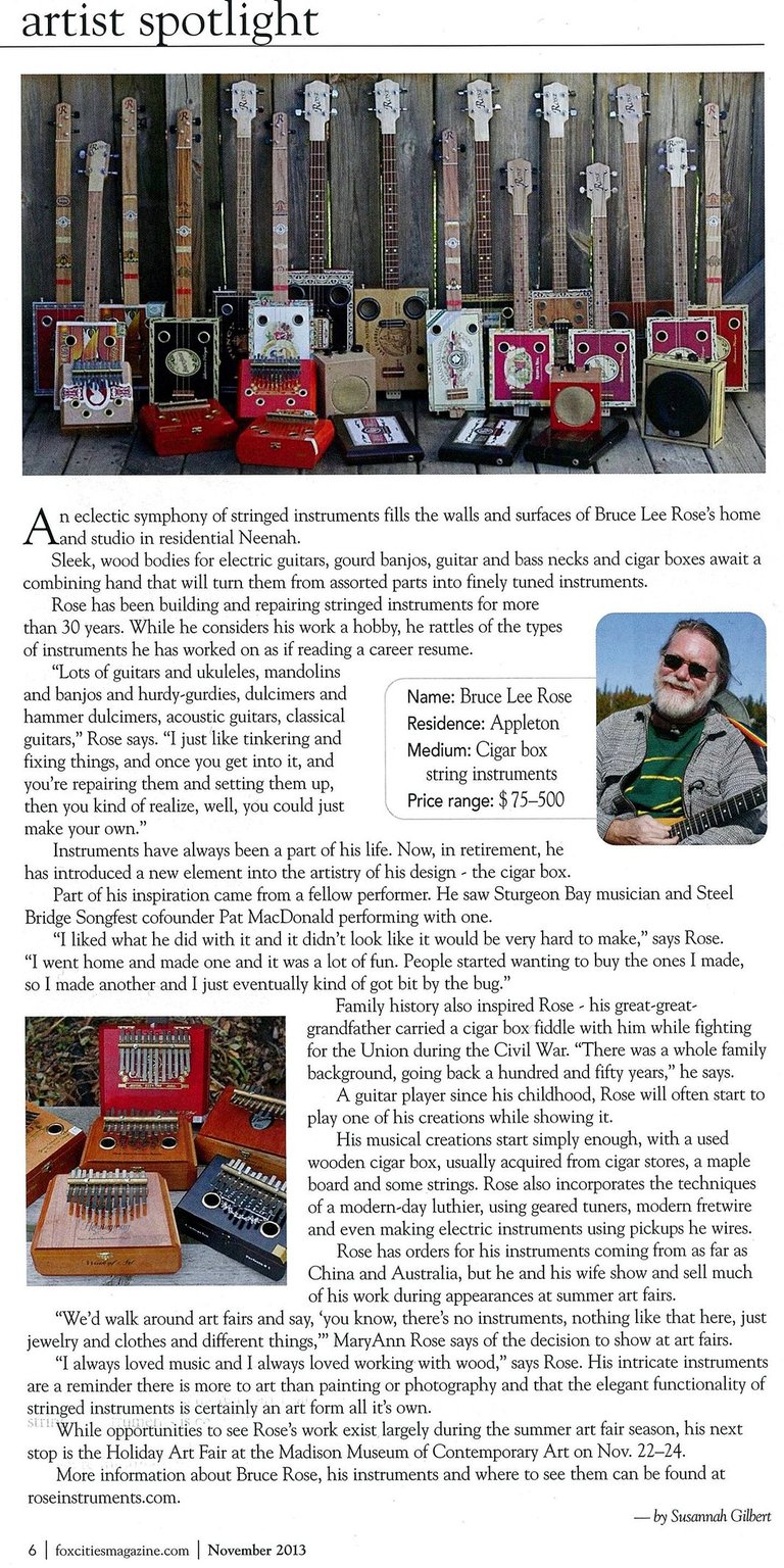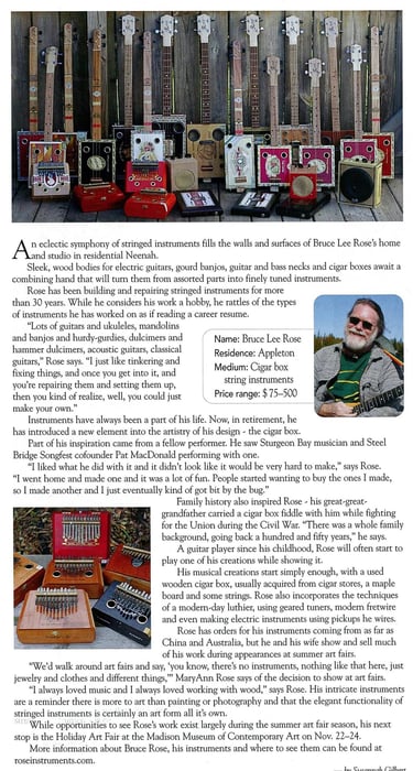 Hello, and welcome to the online home of Rose Instruments. I spent many years building and repairing stringed instruments of all kinds. Originally I built primarily acoustic guitars, ukuleles, and mandolins, but about 20 years ago I wandered into the world of cigar box guitars, eventually spending more than a dozen years on the fine art festival circuit displaying and selling my cigar box creations: guitars, ukuleles, banjos, basses, mandolins, bouzoukis, charangos, thumb pianos, and more. Along the way I was written up in magazines and newspapers, profiled on the PBS television program Wisconsin Life, and filled a wall with ribbons and awards. During this time I developed an abiding interest in guitar pickup design, eventually returning to building traditional instruments, but this time primarily electric guitars. These days, along with guitars I also build and mod amplifiers and effects pedals, recone vintage speakers, and I am also still fascinated with pickups, and continue to work on perfecting my older designs as well as developing altogether new pickup models. Please enjoy your visit!
